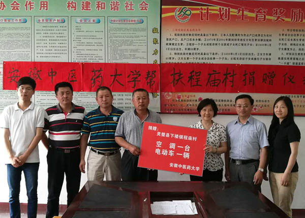 近日,副校长戴敏率队赴学校定点扶贫单位灵璧县下楼镇程庙村调研扶贫工作,看望我校挂职扶贫干部蔡杰、孙道礼、王向阳三名同志,并代表学校向下楼镇程庙村捐赠了一台空调和一辆电动车。学校药学院党委书记吴达武、党委组织部周其艳等陪同看望。