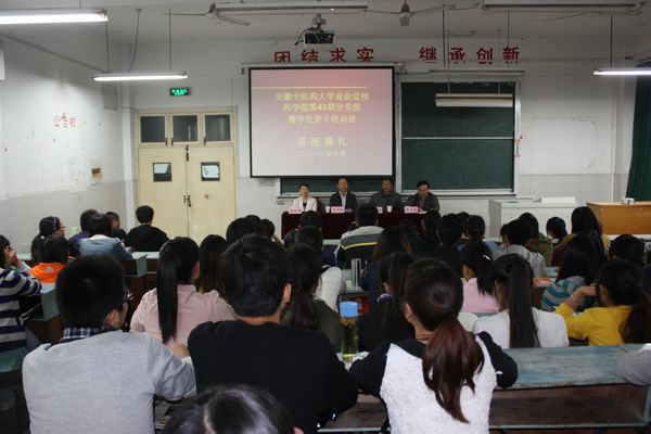 10月28日晚,安徽中医药大学业余党校药学院分党校第43期入党积极分子暨学生骨干培训班开班典礼在西区举行。学校党委组织部部长王道和,学校特邀党建组织员姚道云,药学院党总支书记吴达武、副院长桂双英和本期业余党校班主任金晓琴出席了开班典礼。开班典礼由吴达武主持。