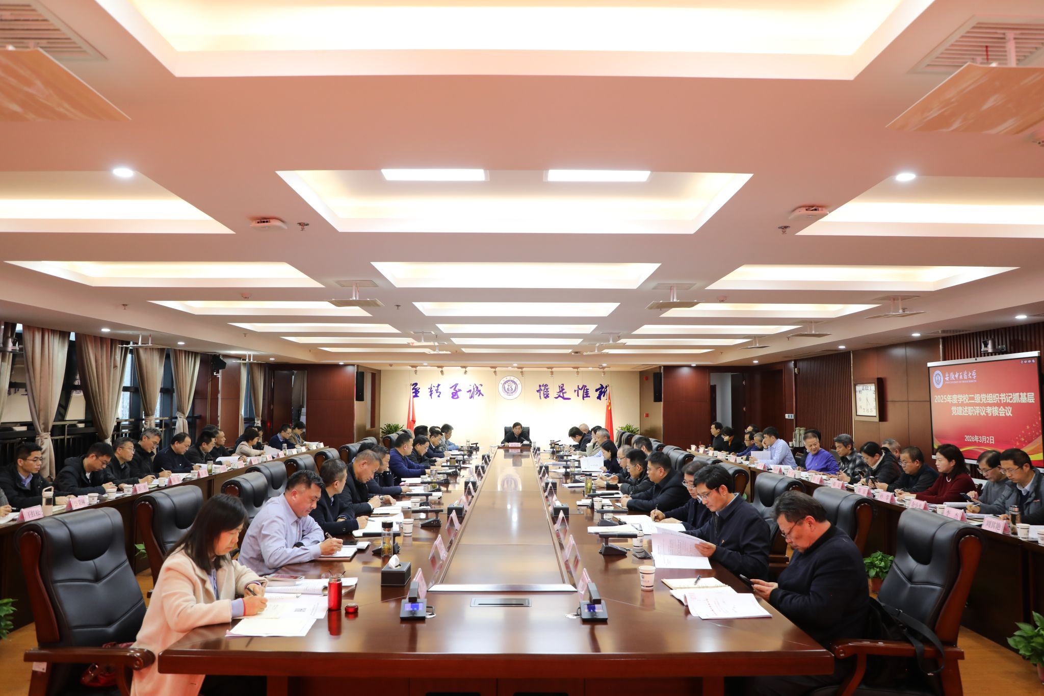 谢瑞瑾强调,2026年是中国共产党建党105周年,是“十五五”开局之年,也是中央部署在全党开展树立和践行正确政绩观学习教育的一年。他指出,政治建设要筑牢“根”与“魂”,绝不允许“偏航”。必须将党的全面领导贯穿于办学治校的全过程,从政治高度审视和推动每一项工作,坚决守好意识形态主阵地,确保大学永远姓“社”、事业永远为“民”。基层基础要实现“强”与“活”,绝不能满足“过关”。要持续推进基层党组织标准化规范化建设,深化“党建+”工作机制,建强专职组织员和党务工作队伍,让每个支部都成为党旗高高飘扬的战斗堡垒。干部人才要激发“劲”与“能”,绝不能陷入“内卷”。要树立鲜明的实干导向,让在“双一流”建设一线、在服务安徽发展前沿敢担当、有实绩的干部脱颖而出。对于安于现状、不敢碰硬、党建业务“两手软”的干部,将坚决予以调整。融合发展要突出“实”与“效”,绝不能搞“花架子”。要自觉将党建工作融入学校事业发展全局,聚焦“十五五”发展目标,找准切入点。主动对接教育强国、健康中国、中医药振兴等国家战略及安徽“三地一区”建设,将学校的独特优势转化为服务发展的强大动能。