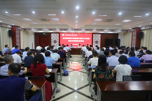 童玲代表省委第十九考核组反馈了我校综合考核情况。考核组认为,2018年学校能够深入认真学习习近平新时代中国特色社会主义思想和党的十九大精神,扎实推进“两学一做”学习教育常态化制度化,党的建设得到加强,管党治党水平得到提升;坚持党的教育方针,落实立德树人根本任务,以地方特色高水平大学建设为主线,以十届省委巡视及整改和本科教学评估为抓手,推进学校事业发展取得新成效,总体运行情况良好。在发展方面,学校依法治校工作扎实推进,人才培养力度不断加大,科学研究水平进一步提升,社会服务和国际交流合作得到深化;在党建方面,学校政治与思想建设进一步加强,干部队伍和人才队伍建设不断加强,基层党组织建设不断夯实,党风廉政建设扎实推进。考核组指出考核中发现的问题和不足,就下一步工作提出了意见与建议,要压紧压实党建工作主体责任,要扎实推进基层党组织建设,要进一步强化干部队伍建设,要着力加强学校内涵建设,要推进作风建设不断深入。